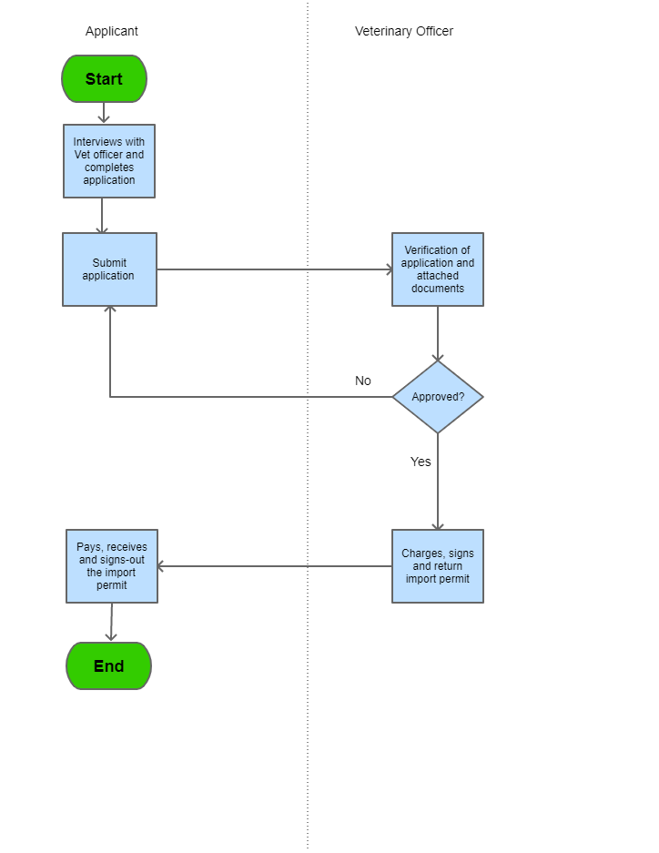 The applicant interviews with the veterinary officer, providing all necessary details of the intended import and any accompanying documents. |