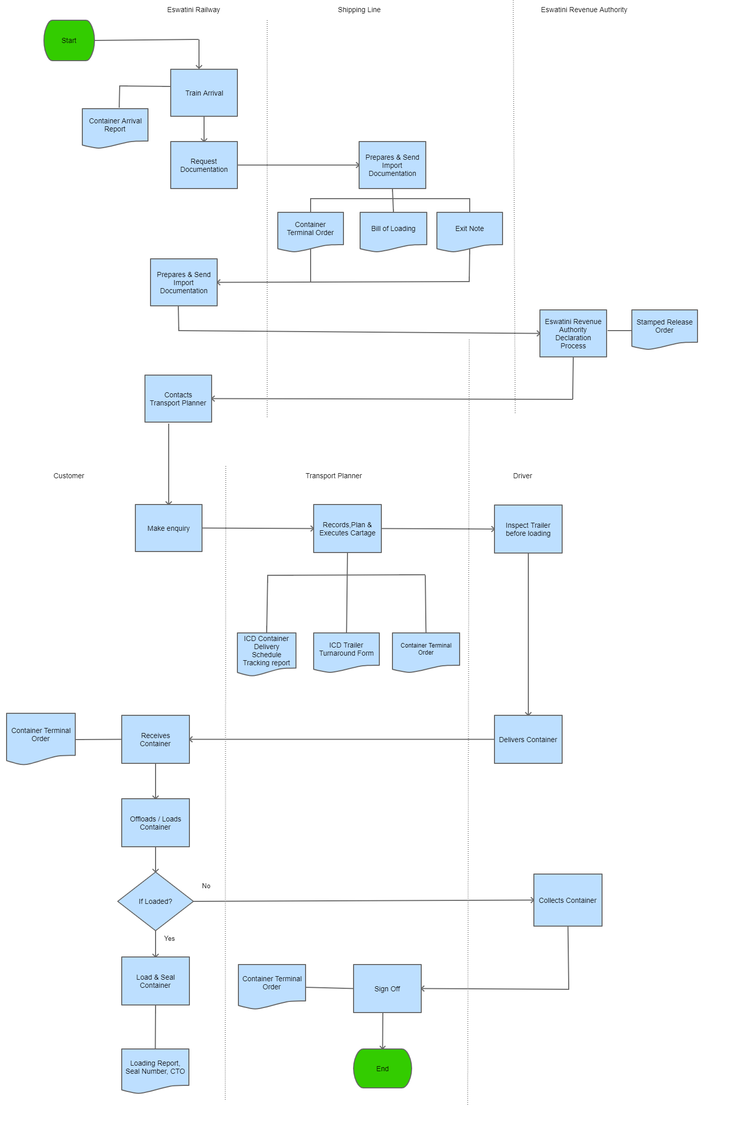 Eswatini Railway Operations Clerk contacts Transport Planner, and a customer follows the cartage handling steps that follows below |