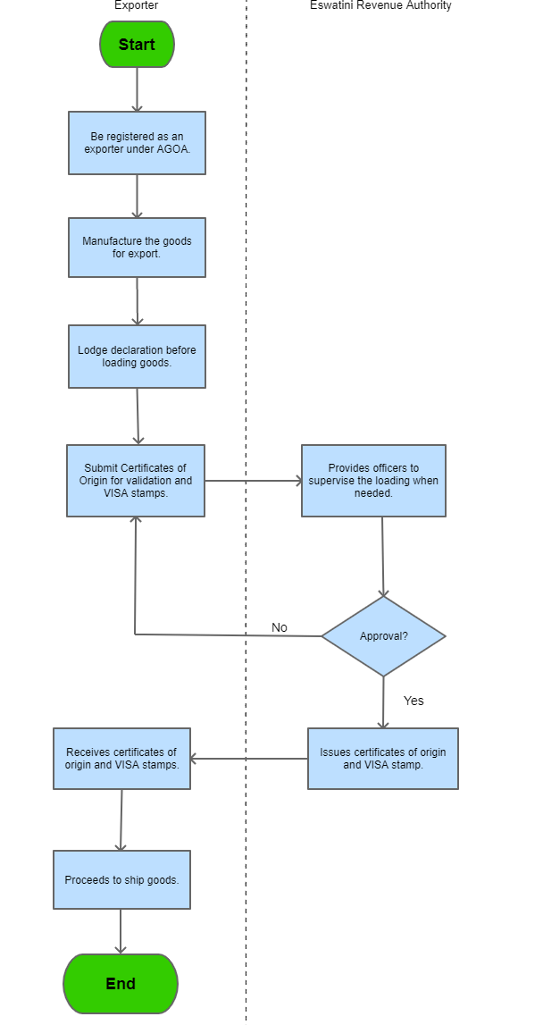 | Exporting Under AGOA | Duty/Tax Payable | AGOA refers to the African Growth Opportunity Act. Exporting under AGOA speaks to procedures to be followed as part of the administrative requirements set up to enable the registration of exporters and implementation of processes that will render the goods exported through these processes to benefit under AGOA and qualify for preferential treatment upon their importation into the US markets. | To be registered as an exporter under AGOA, an application should be submitted by completing forms CE185 (for manufacturers) and CE 49 02 (for exporters). Any exporter, manufacturer or trader of originating goods, permanently established in Eswatini or having headquarters in Eswatini, is entitled to apply to the ERA to become a registered Swazi exporter, provided that he holds, at any given time, appropriate evidence of the origin of the products he intends to export, for the purposes of checks carried out by the ERA. | The Customs and Excise Act, 1971 | 09-09-9999 | Good |